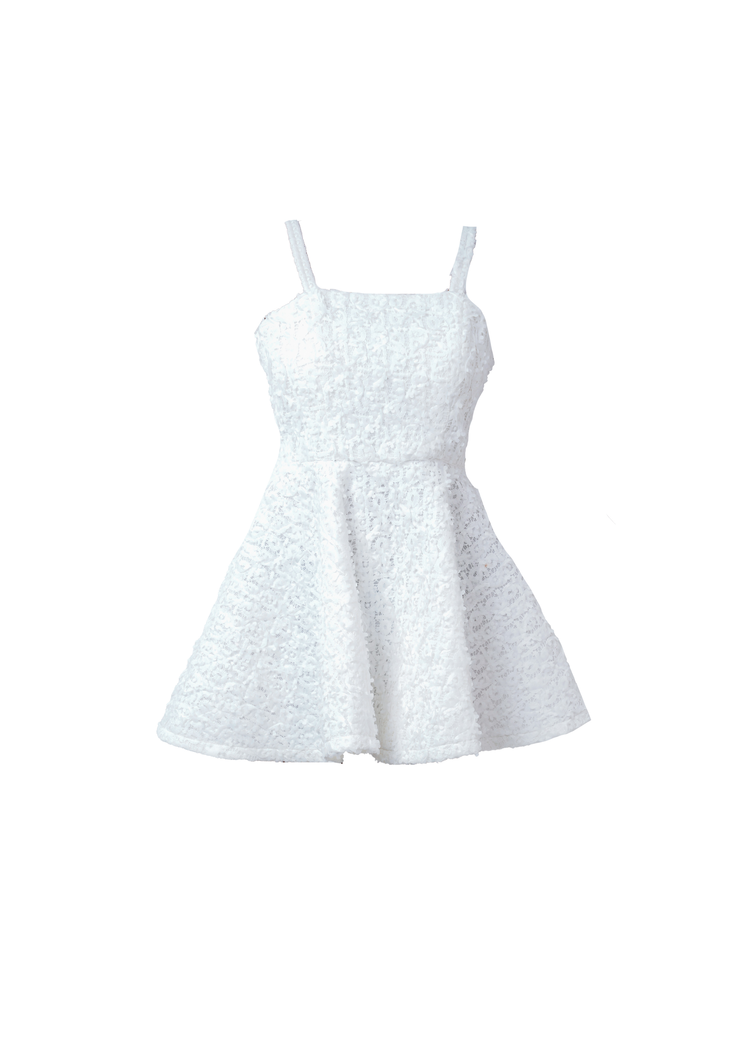 با این پیراهن عروسکی سفید ، در هر مراسمی درخشان باشید! پارچه گیپور گل برجسته و دامن فون بالای زانو ، ظاهری رمانتیک و شیک به شما می دهد . انتخاب ایده آل برای خانم های عاشق زیبایی و جذابیت !